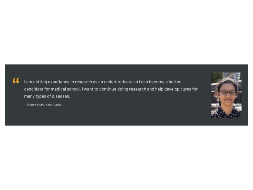 A screenshot of the Research at Kean webpage, with an image of a female student in a lab