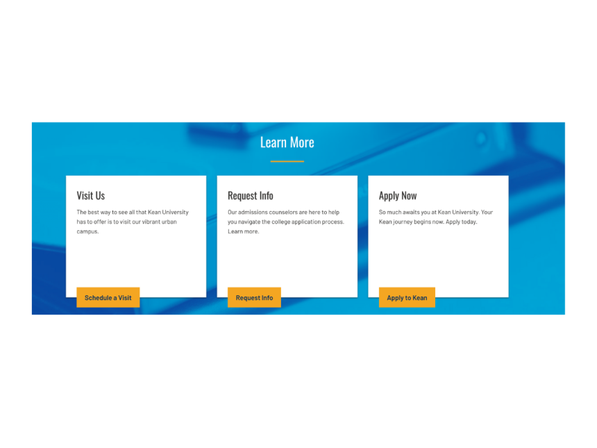 Kean.edu is built on the Drupal content management system. The site features a versatile component library of design elements that can be combined to create functional and attractive designs.